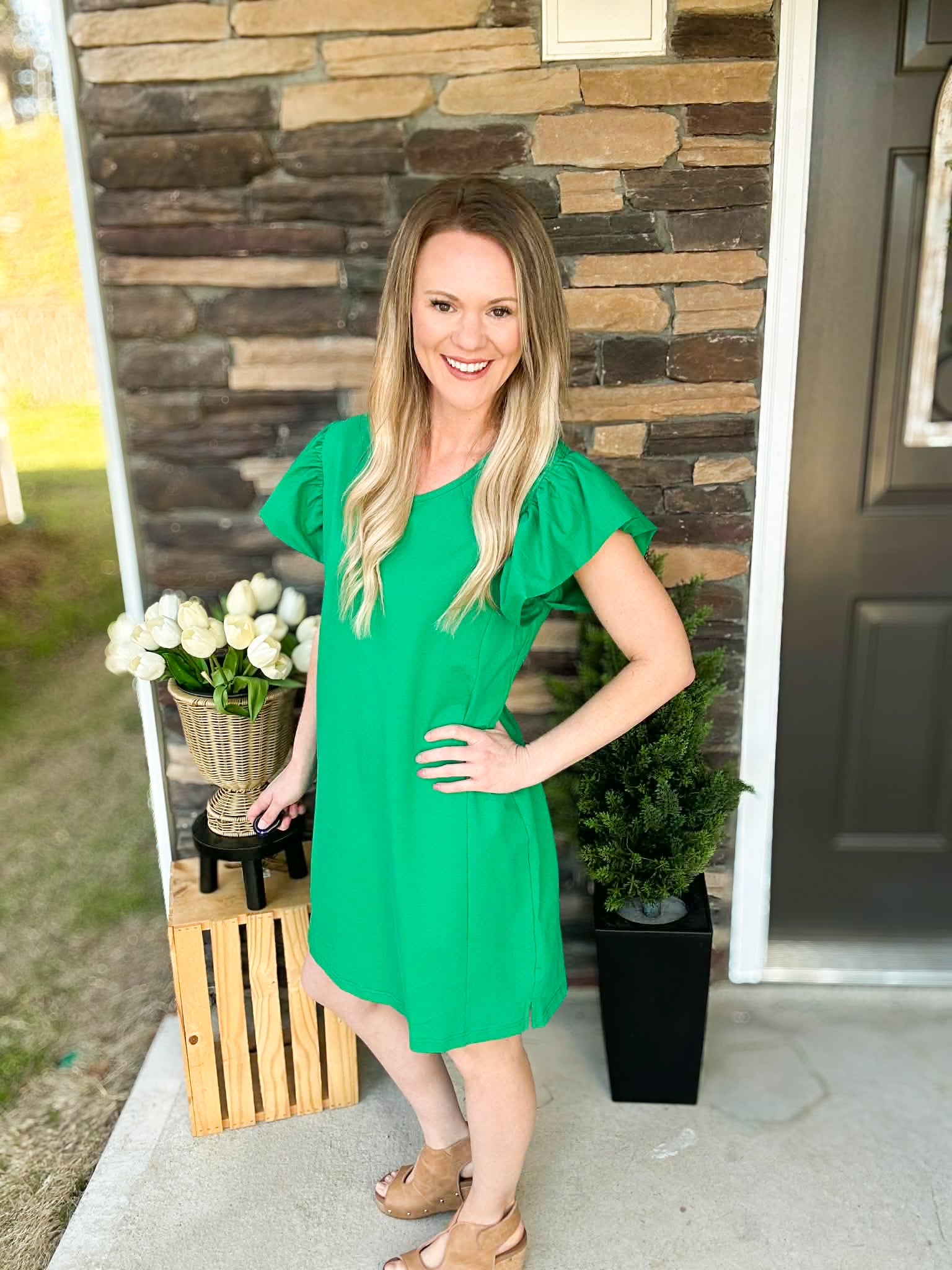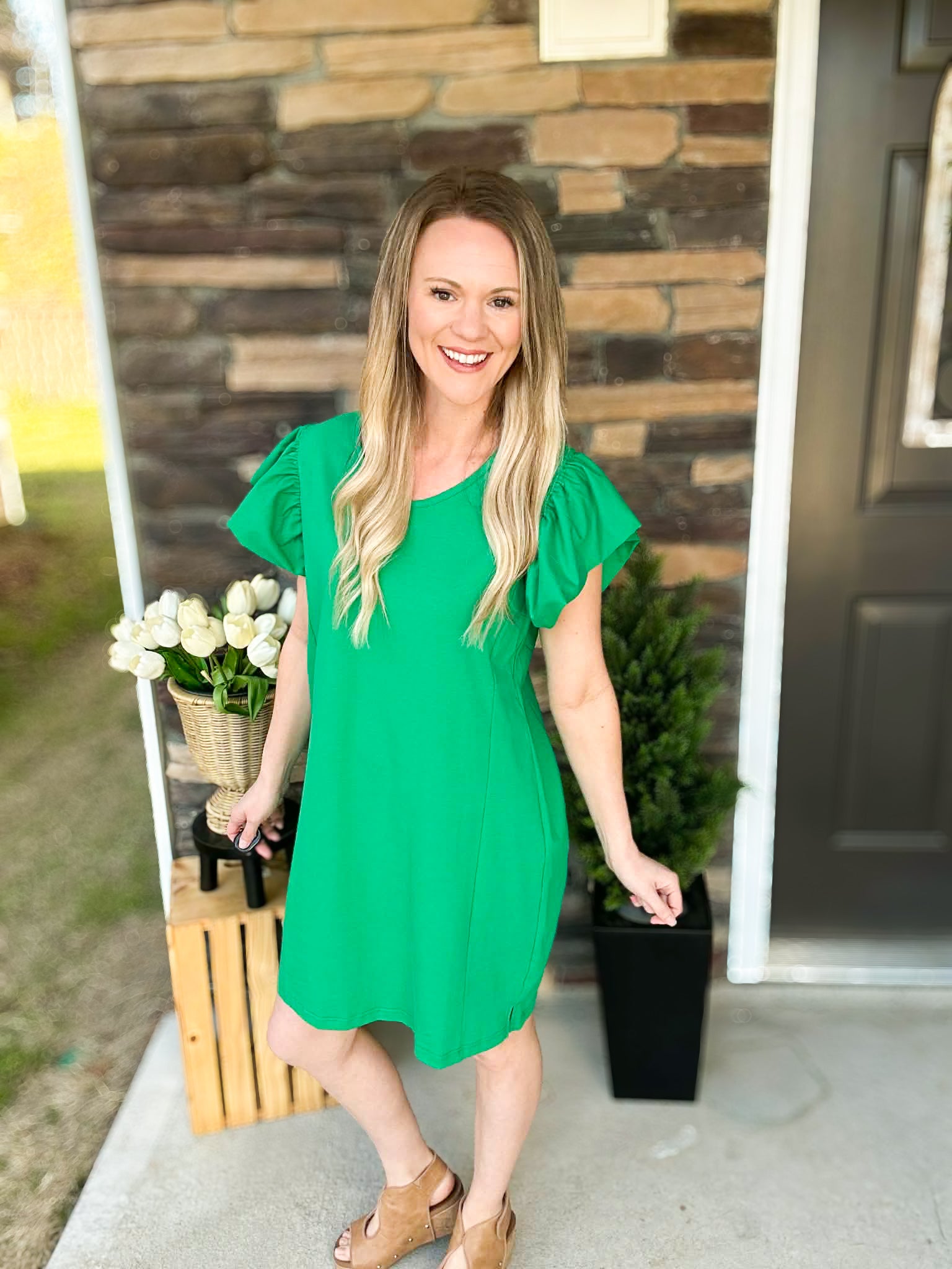This dress is that effortless, throw-it-on-and-go piece your closet needs. With its soft, stretchy fabric and feminine flutter sleeves, it gives you that polished look without sacrificing comfort. Whether you’re heading to brunch, church, a shower, or just out for the day, this one makes getting dressed easy.