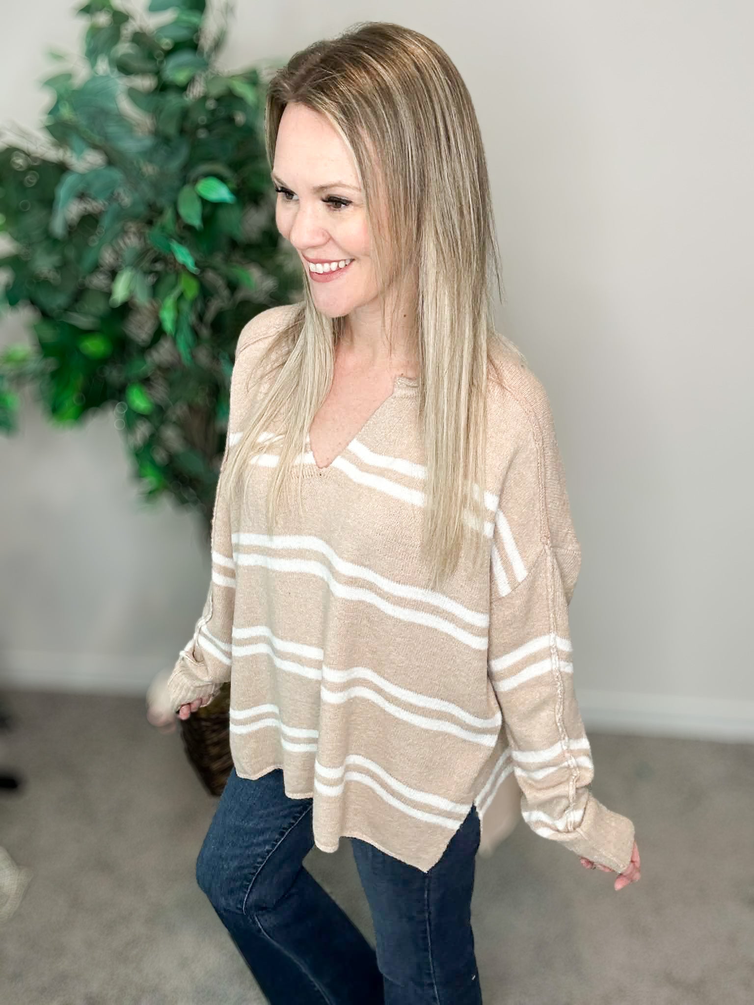 This beige notch neck striped sweater is that effortless, goes-with-everything layer.