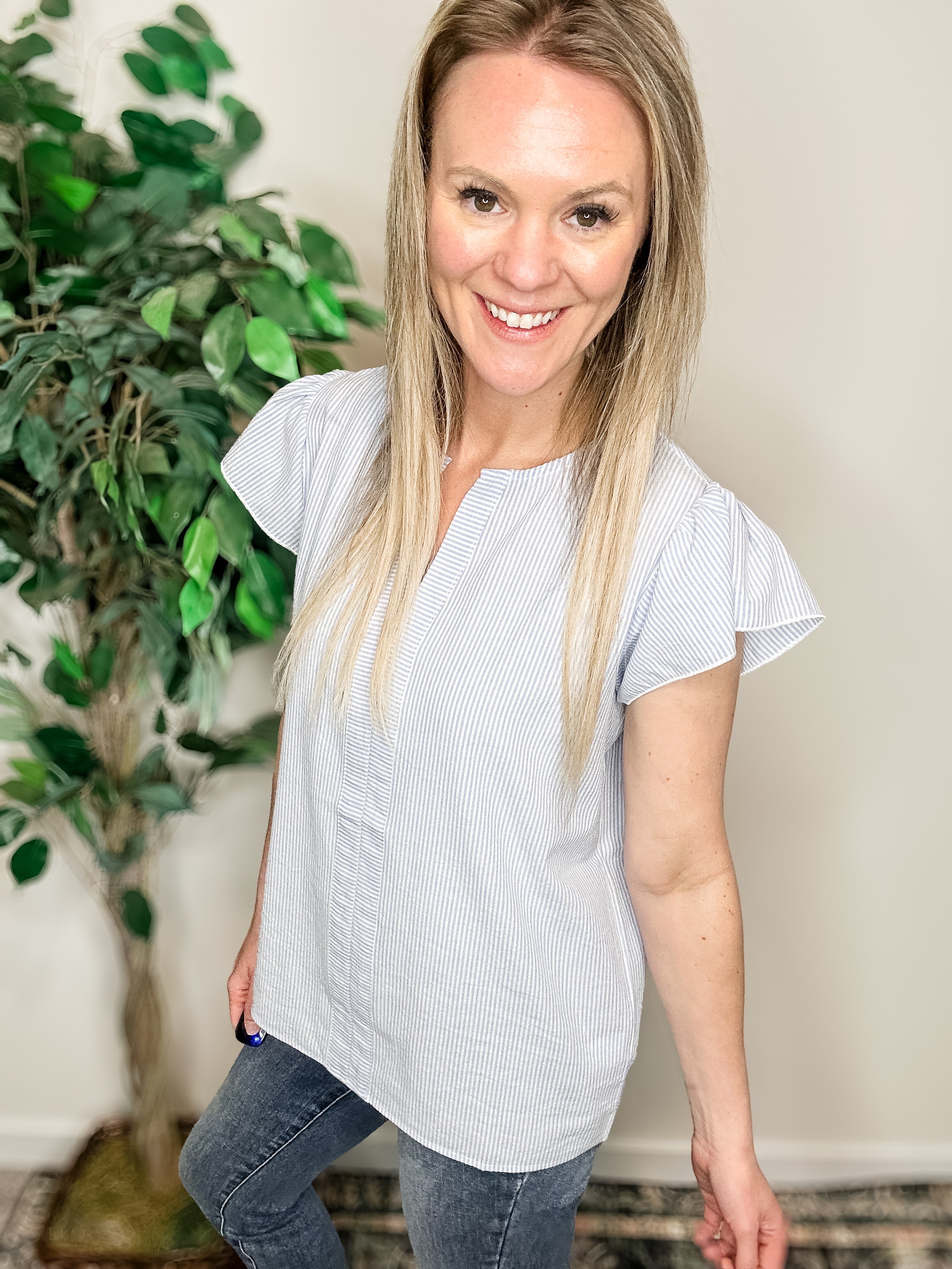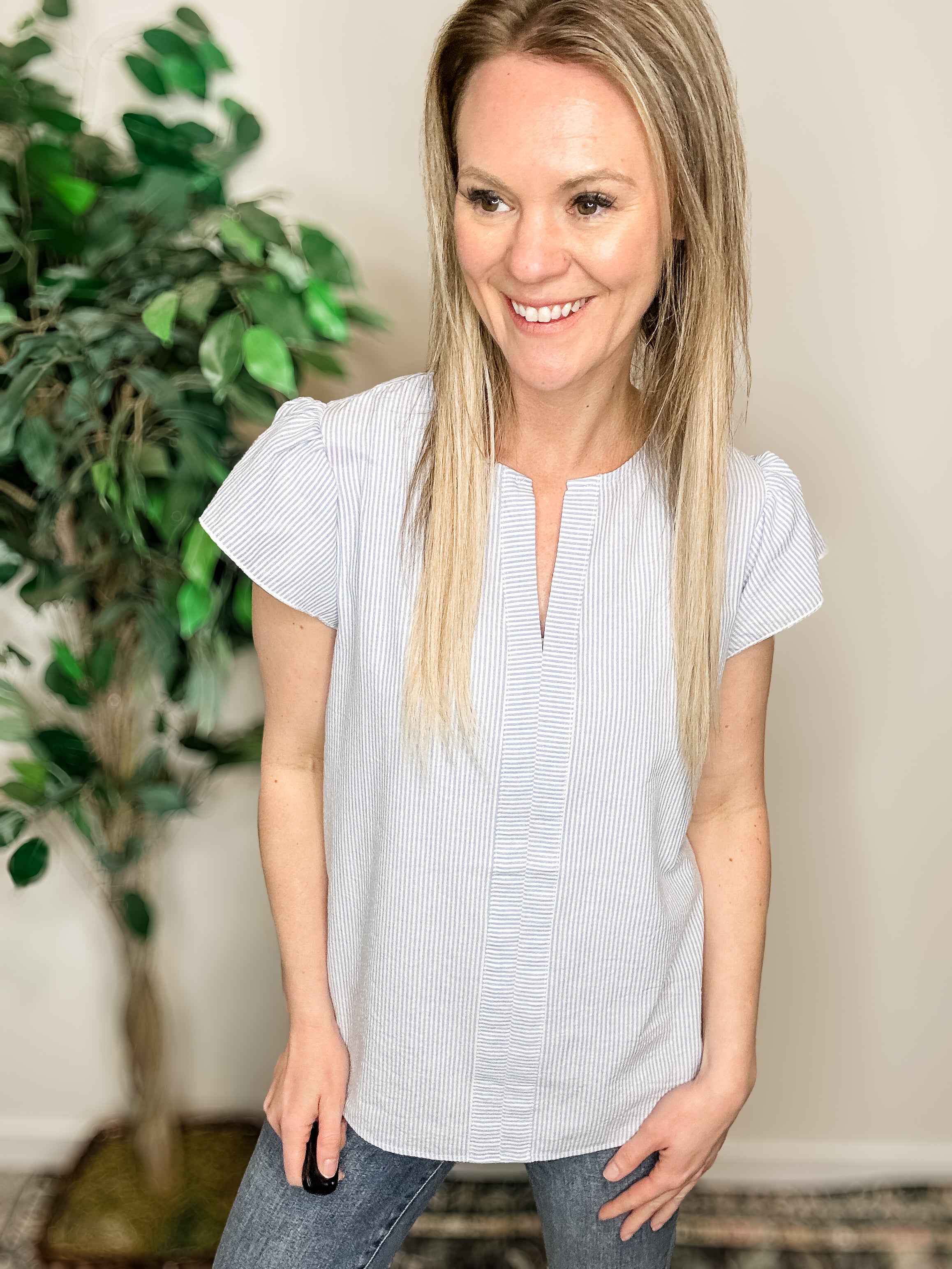 Effortless, polished, and just the right amount of feminine 🤍 This pinstripe top is one of those pieces that makes you look instantly put together without even trying.