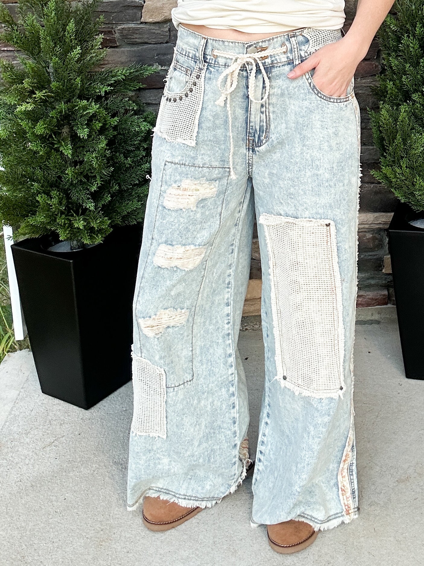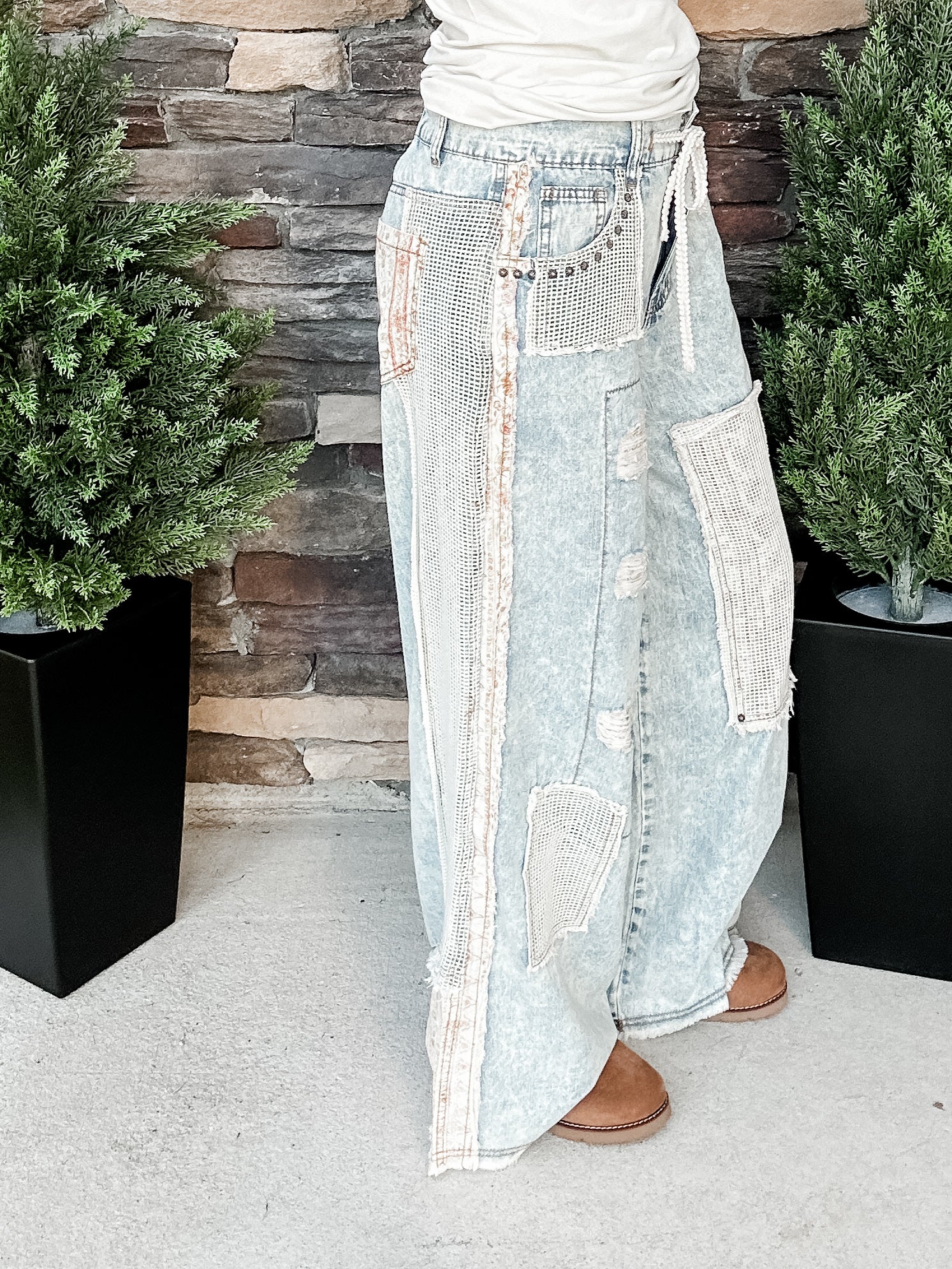 If artsy, boho, and bold had a baby… it would be these jeans. The light acid wash sets the stage, but the oversized netted lace patches, distressing, studs, and rope tie detail take them straight into statement-piece territory.