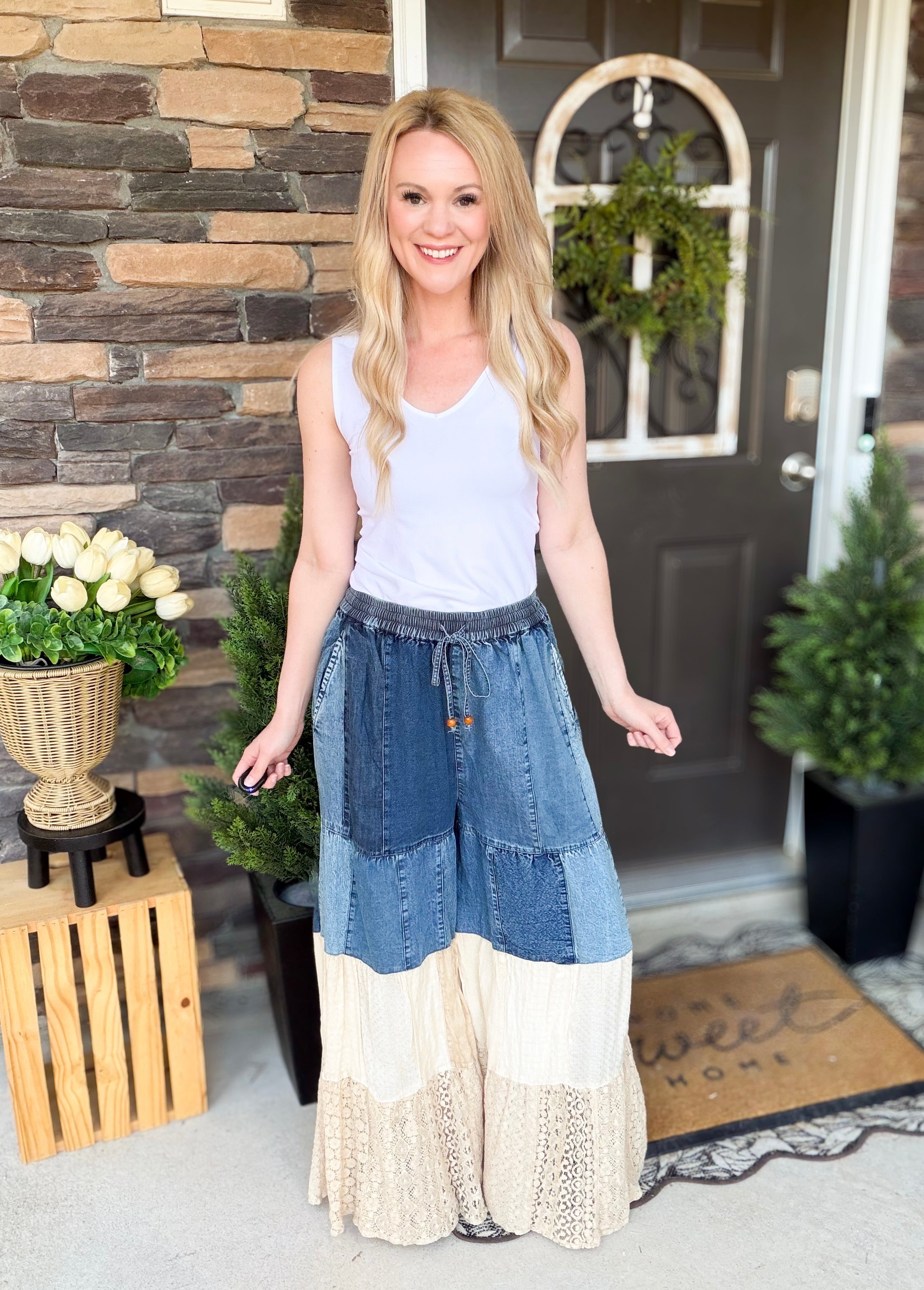 These mixed denim and lace wide leg pants are what happens when edgy meets romantic — and we are OBSESSED. The structured denim up top paired with flowy lace panels at the bottom? Absolute main character energy.