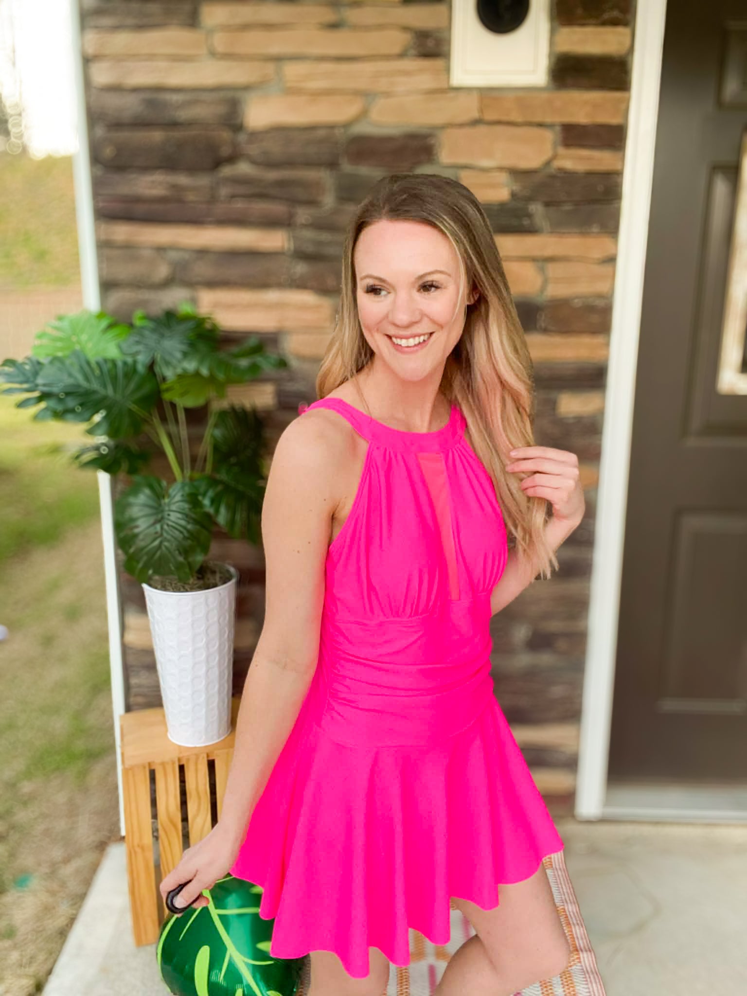 This flattering one-piece swimsuit combines full coverage with a touch of flirty detail. Designed with a halter neckline and a mesh v-neck accent, it offers a stylish look while still providing the comfort and support you want for pool days and beach trips.